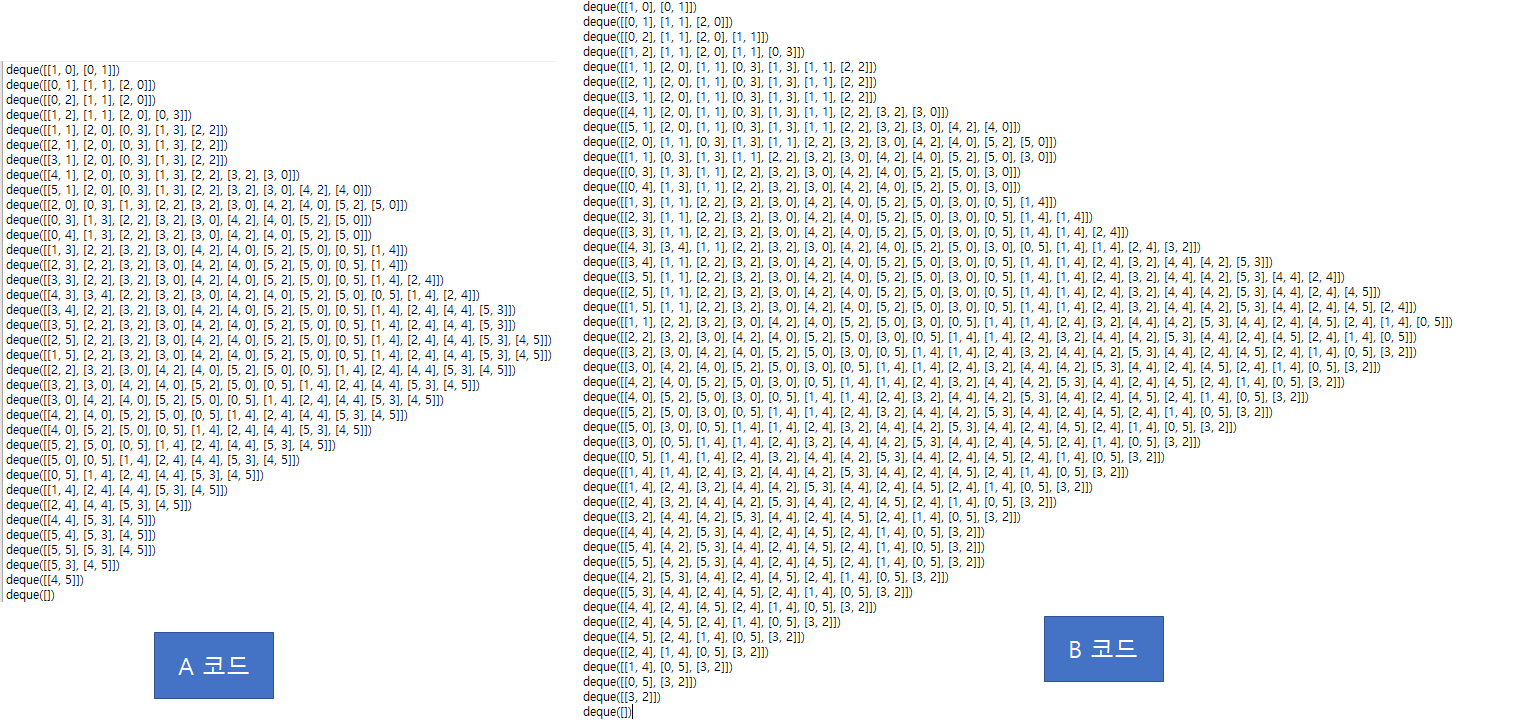 메모리 초과한 원인을 분석하기 위해 BFS 진행 간 A와 B 방식의 Queue 값을 출력했다.