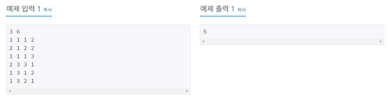 다음 M 줄에는 네 개의 정수 x, y, a, b가 주어집니다. (x, y) 방에서 (a, b) 방의 불을 켜고 끌 수 있다는 의미입니다.