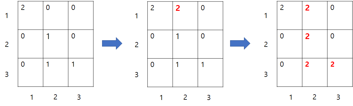 4-2. 주변에 2가 있다면 board 매트릭스의 해당 좌표에 2를 입력합니다.